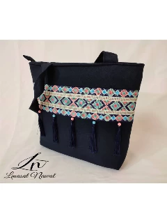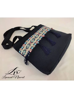 شنطة كبيرة لون كحلي قماش مطرزة تطريز يدوي